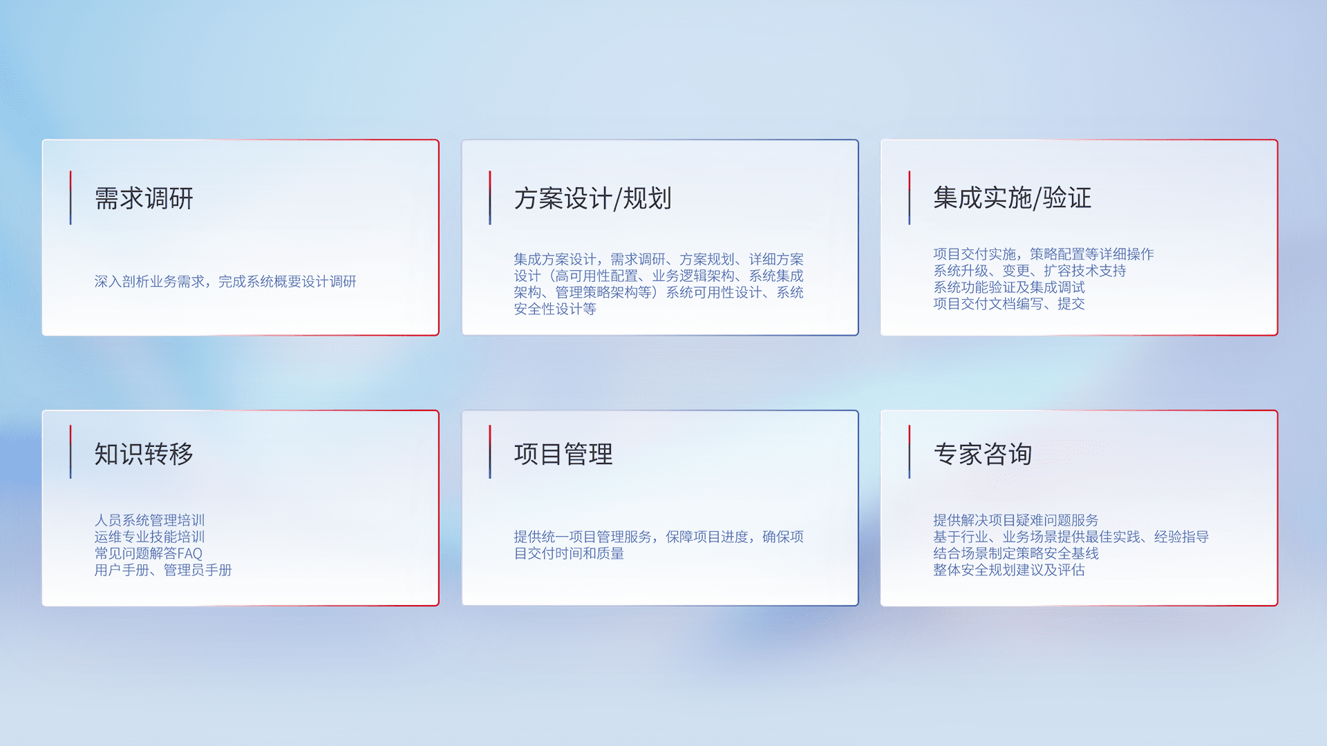 针对客户行业特性,,将宏观的安全战略和需求,,通过专业的交付服务,,,实现项目落地,,为客户提供标准规范的集成交付服务。。。